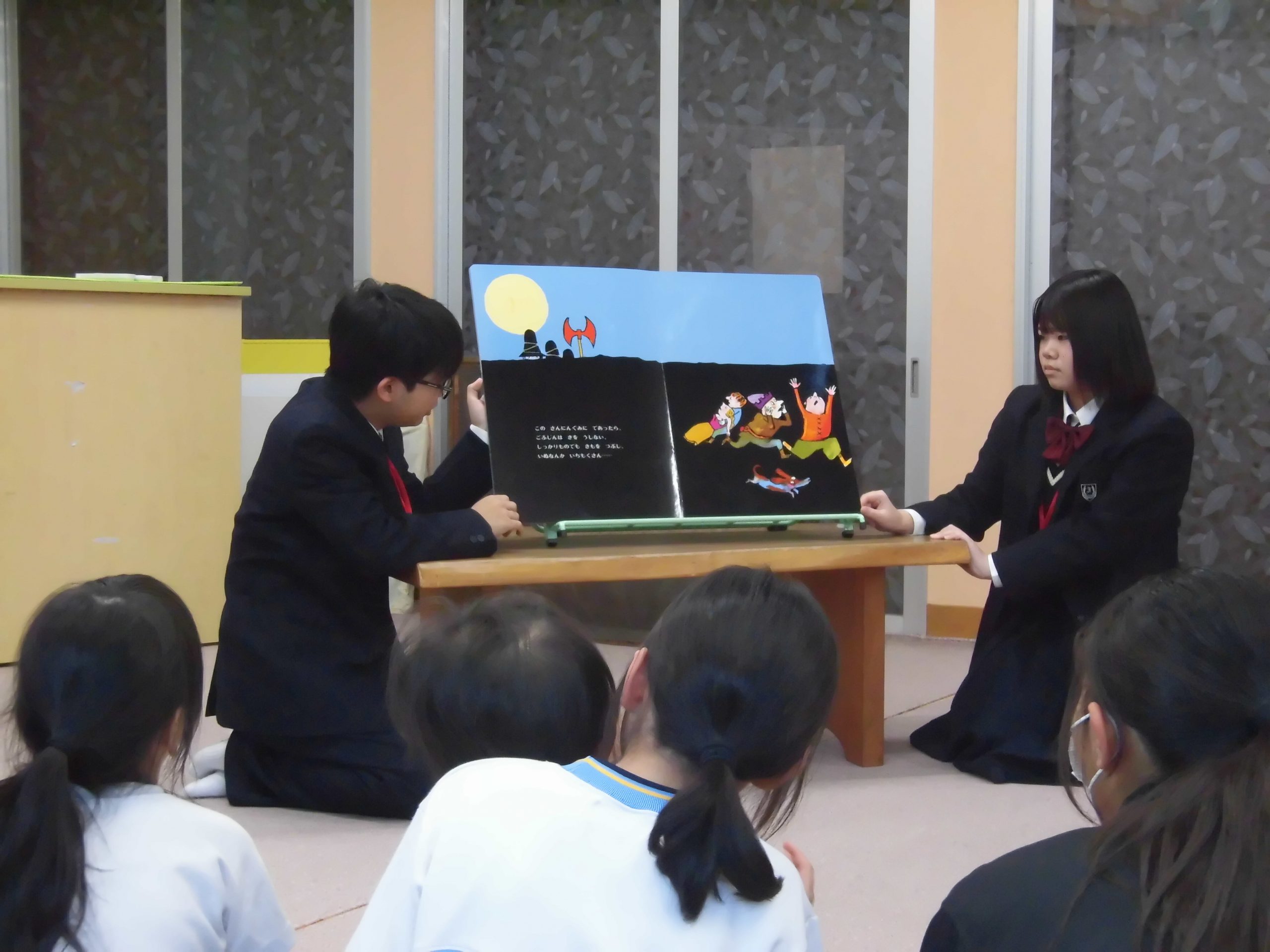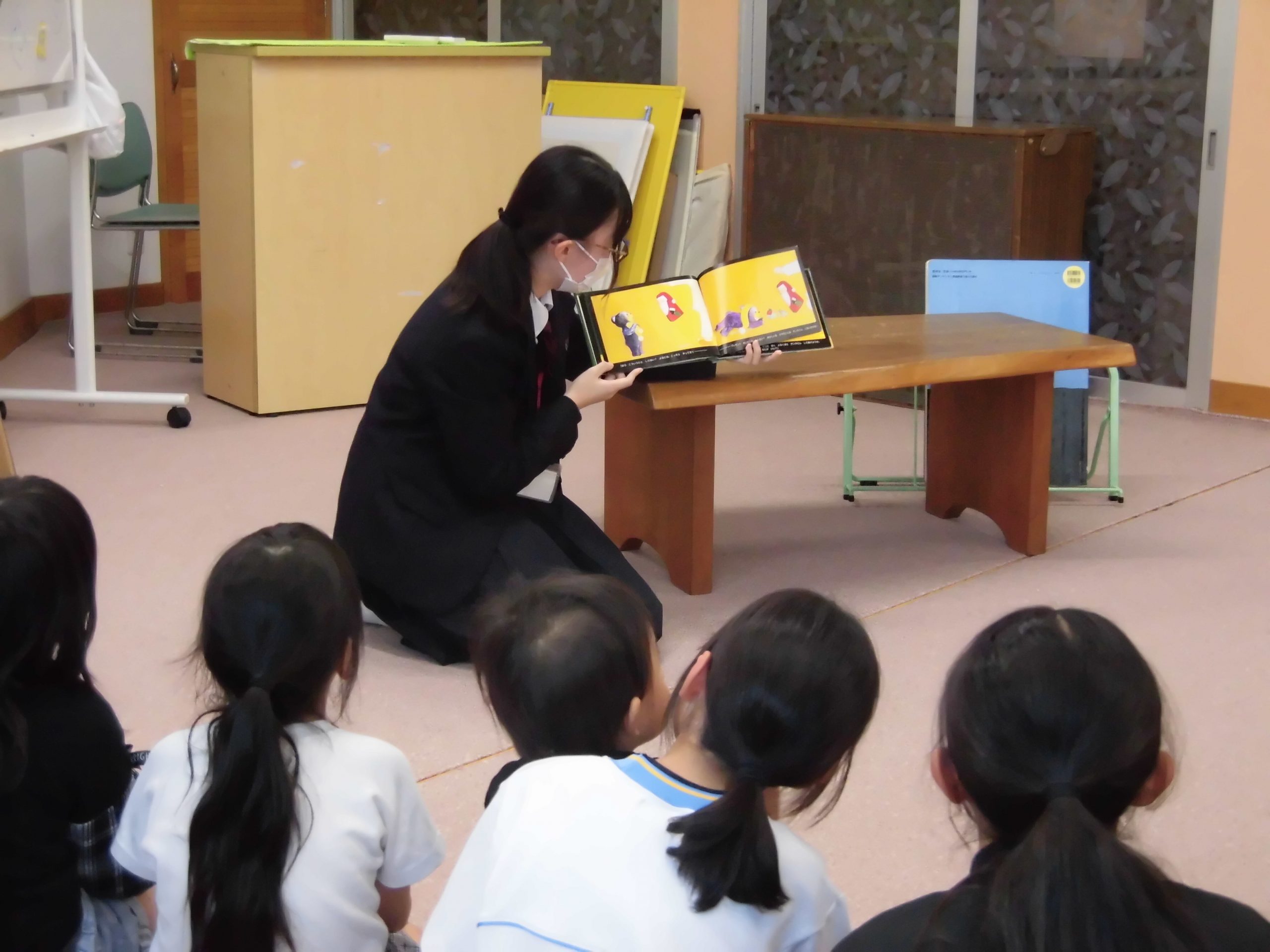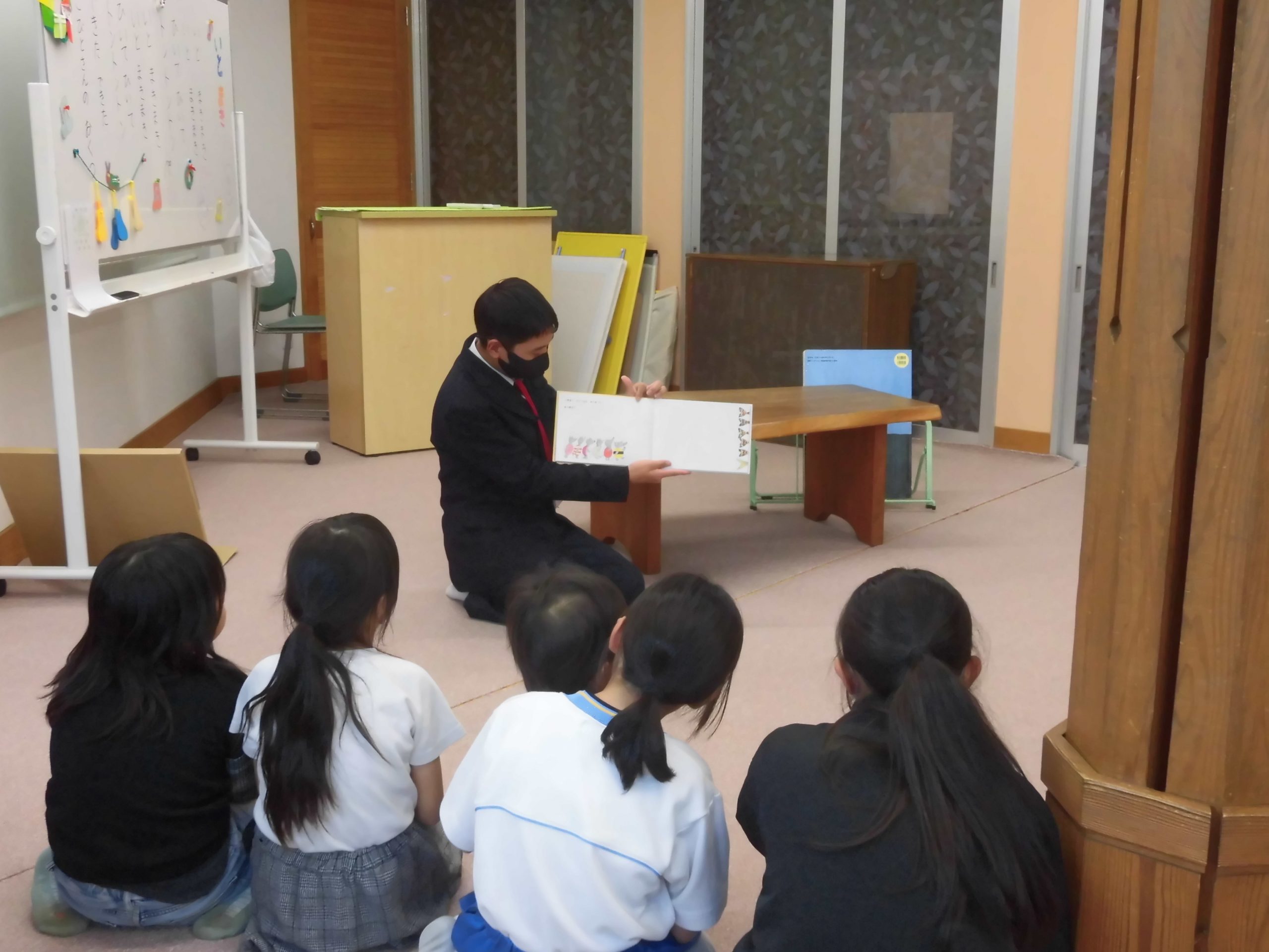 おはなし会では子供たちと仲良く触れ合い、子供たちも大喜び。 読み聞かせも真剣なまなざしで聞いていました。