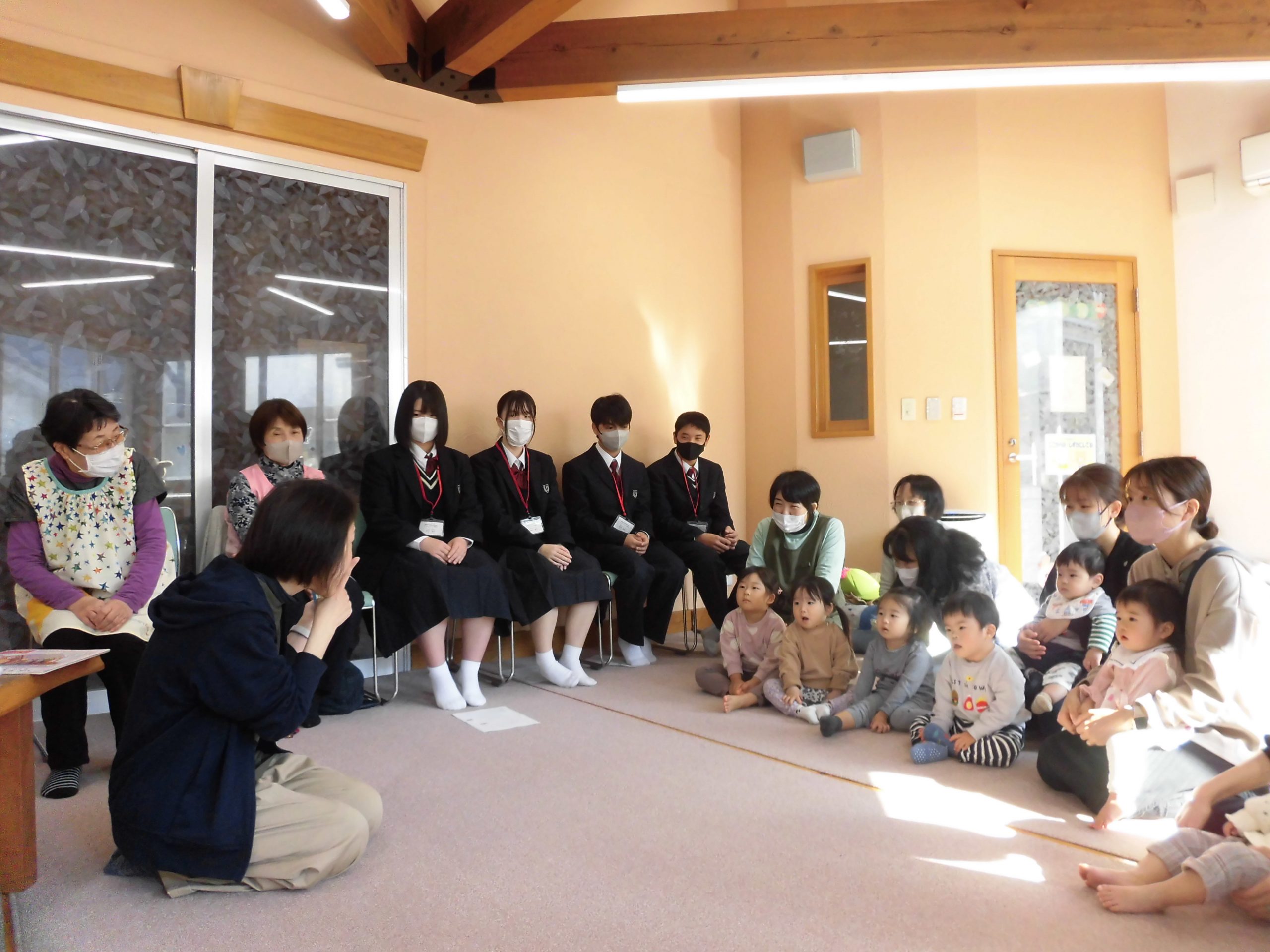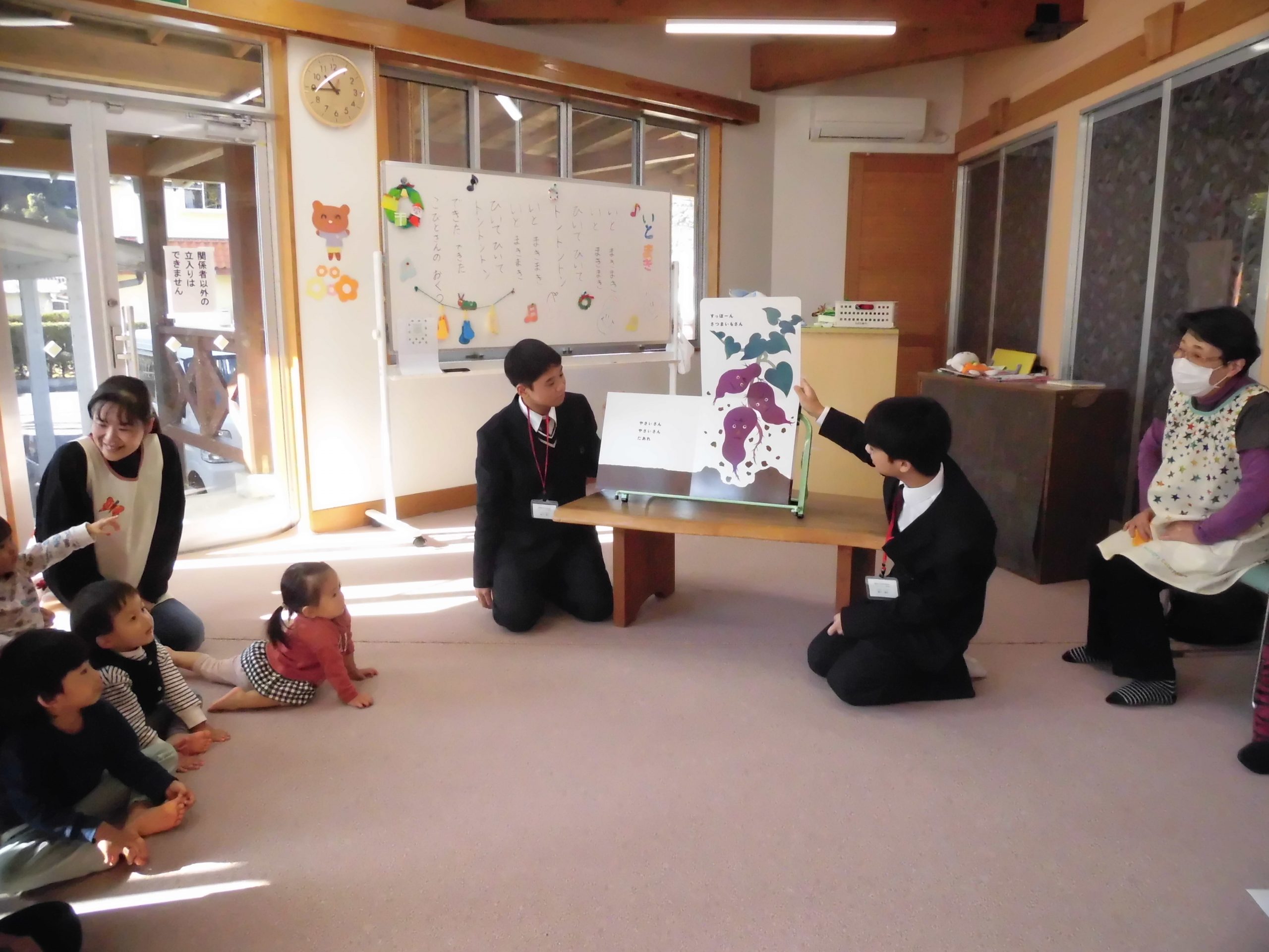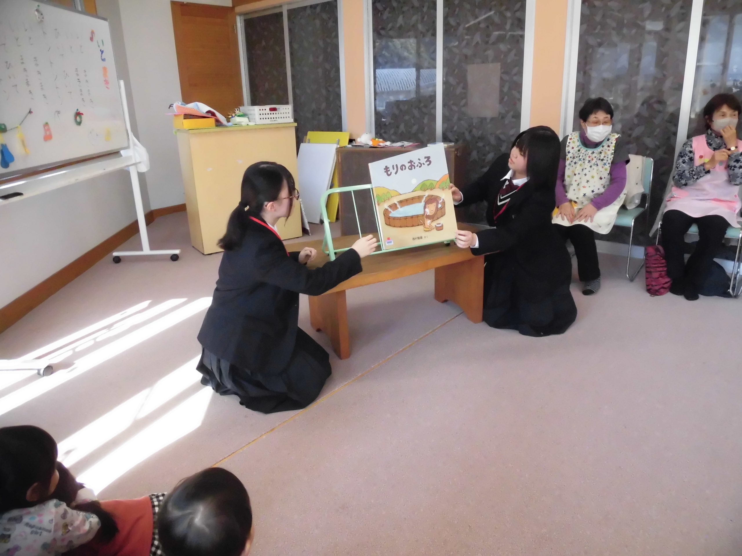 おはなし会では子供たちと仲良く触れ合い、子供たちも大喜び。 読み聞かせも真剣なまなざしで聞いていました。