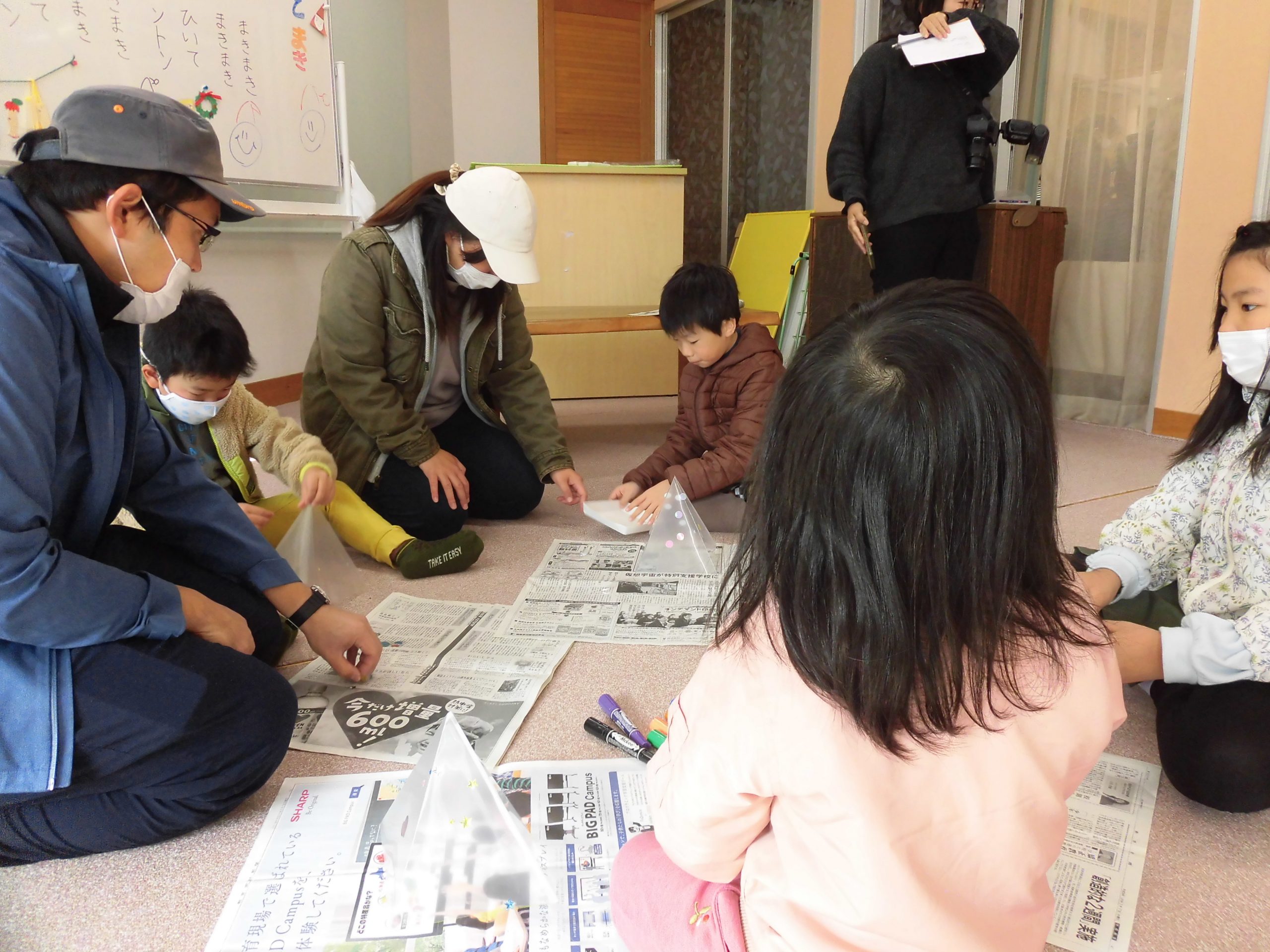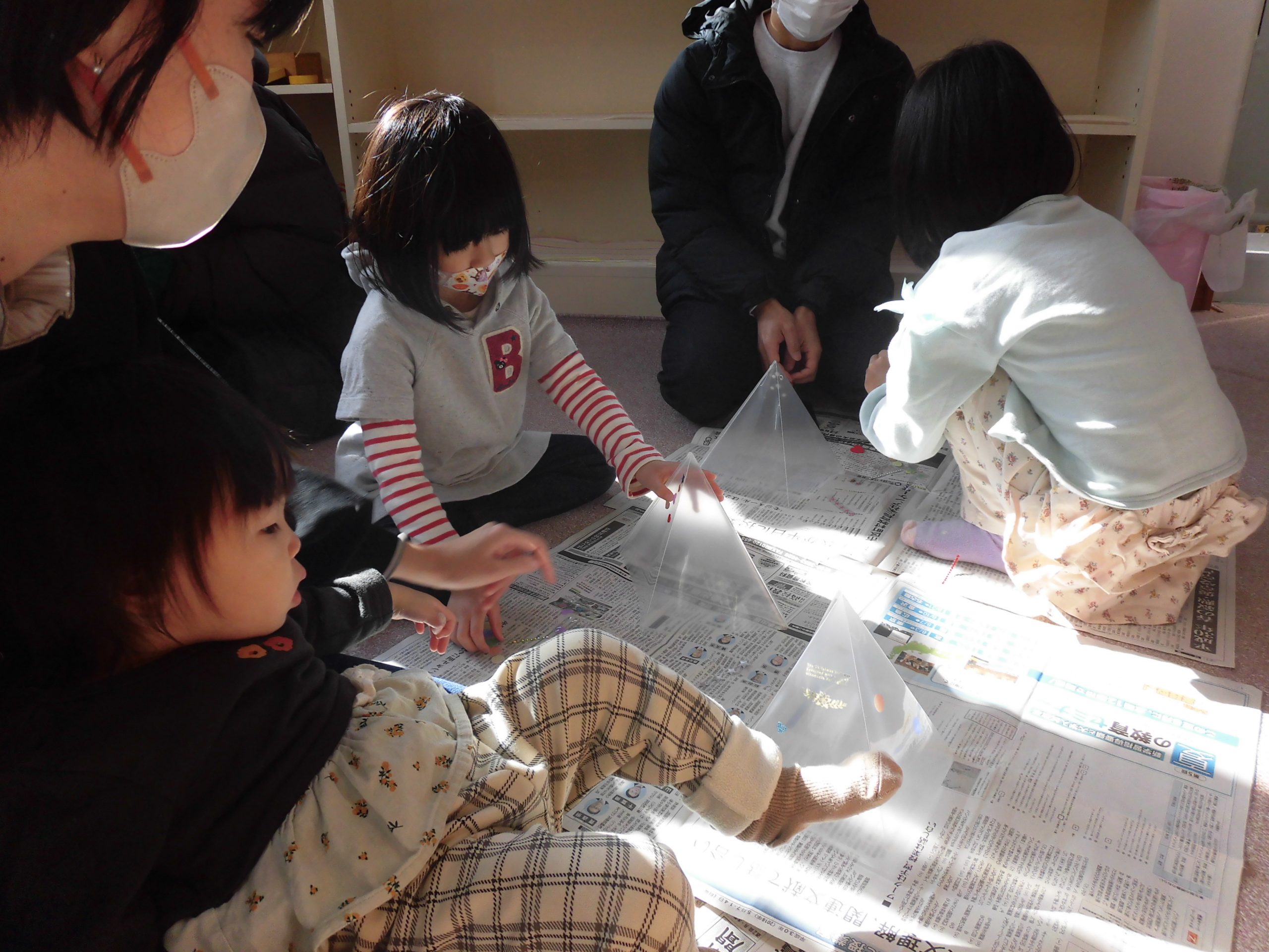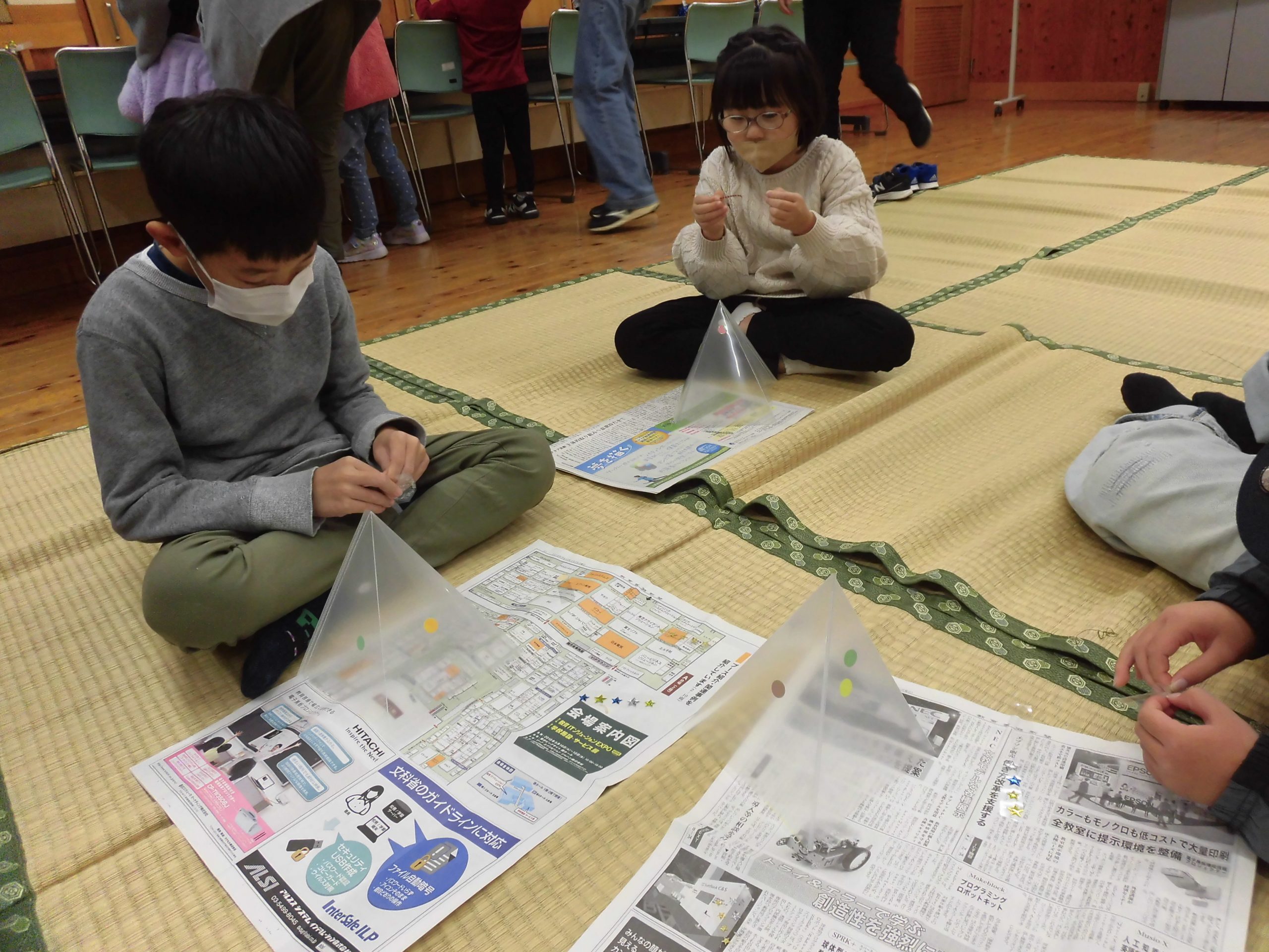 最初に光るクリスマスツリーを作りました。みんな真剣にツリーにシールを貼っています。