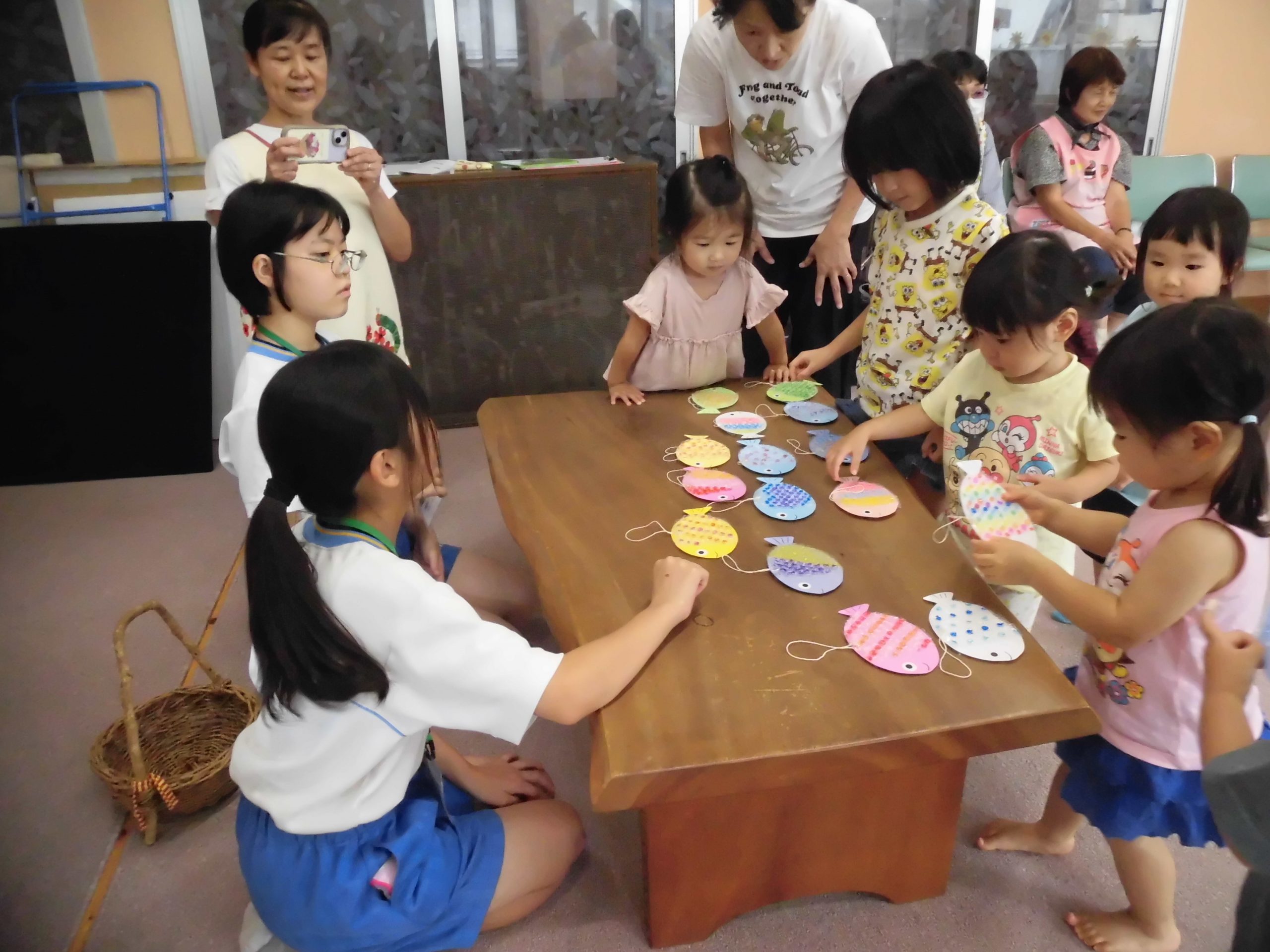 おはなし会の最後は画用紙で作った手作りのプレゼント、ボランティア2人が作ったおさかなです。子ども達はそれぞれ気にいったおさかな🐠をうれしそうに持って帰りました。