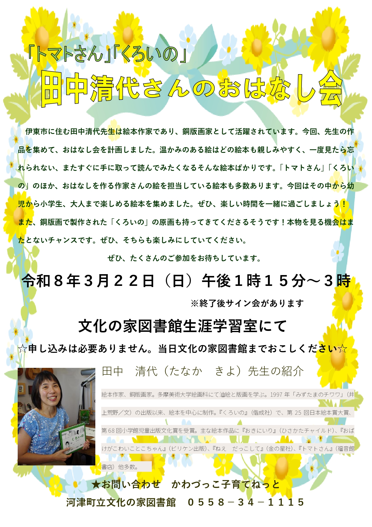🌼3月22日(日) 絵本作家 田中清代さんが文化の家に!!🌼